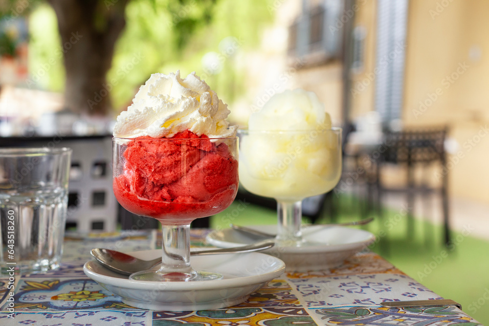 Sicilian granita, Italian summer refreshing dessert made with strawberry and whipped cream, lemon granita on background. Semi-frozen dessert with creamy structure in italian outdoor cafe.