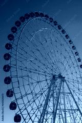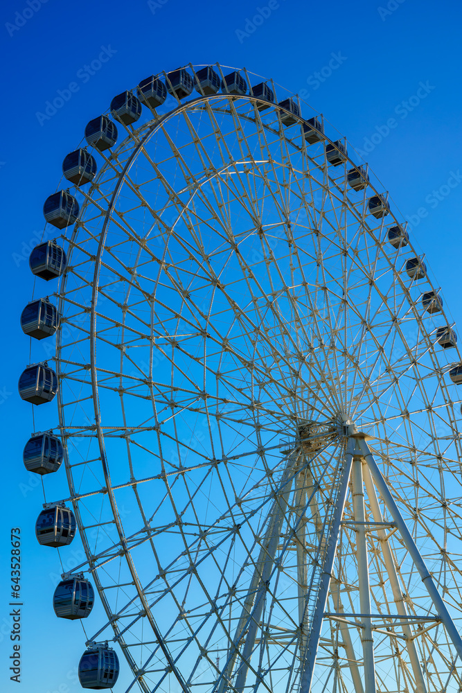 High ferris wheel at sunset or sunrise with blue sky in an amusement park Navruz in Tashkent, Uzbekistan.