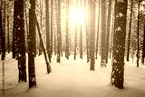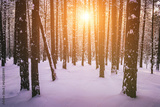 Sunset or sunrise in the winter pine forest covered with a snow. Rows of pine trunks with the sun's rays. Vintage film aesthetic.
