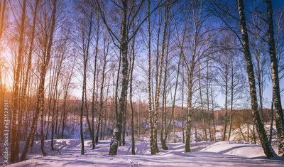 Sunset or sunrise in a birch grove with winter snow. Rows of birch trunks with the sun's rays. Vintage camera film aesthetic.