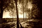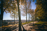 Leaf fall in the city park in autumn with maples. Landscape with maples and other trees. Vintage film aesthetic.
