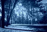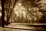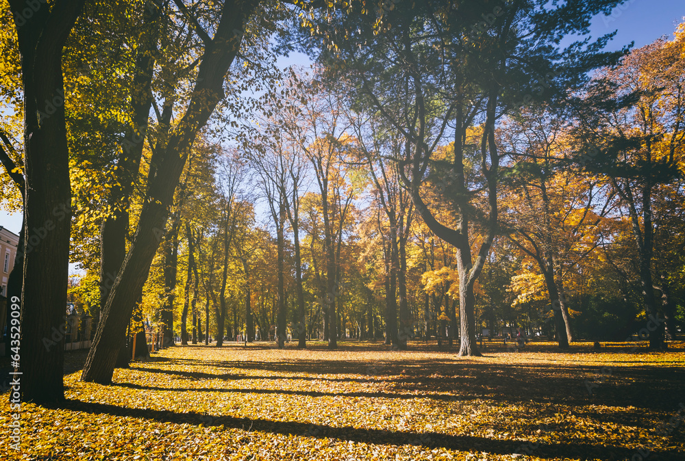 Leaf fall in the city park in autumn with maples. Landscape with maples and other trees. Vintage film aesthetic.
