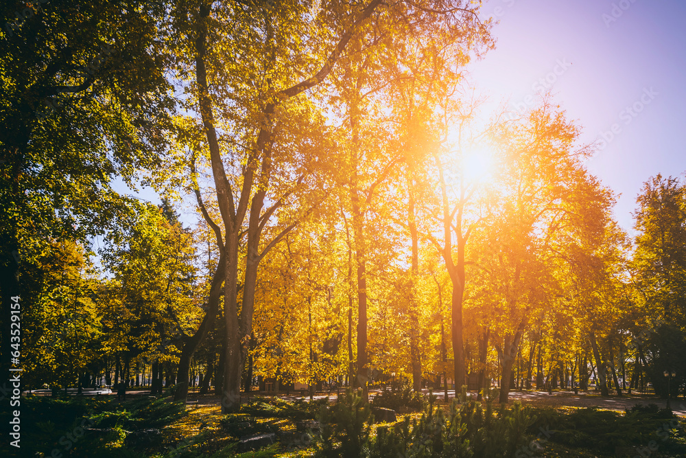 Leaf fall in the city park in autumn with maples. Landscape with maples and other trees. Vintage film aesthetic.