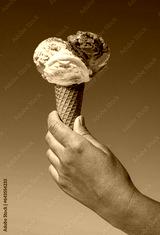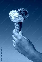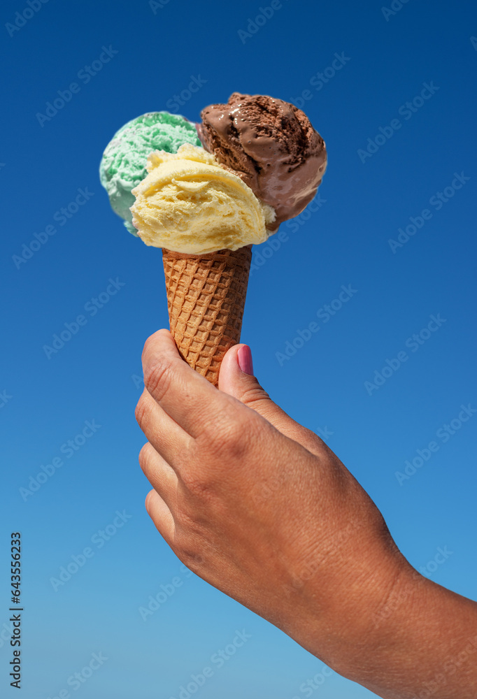 Ice cream cone with colorful ice cream balls in the hand at blue sky background.