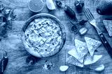 Guacamole, guacamole ingredients and chips on wooden background. Flat lay.