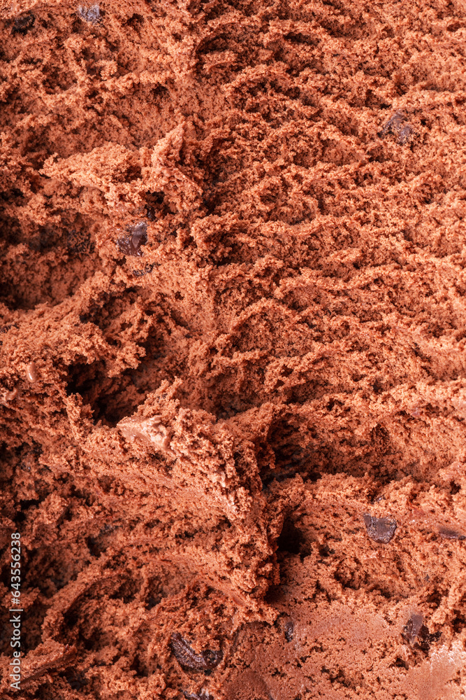 Structure of frozen chocolate ice cream close up. Ice cream background.
