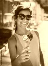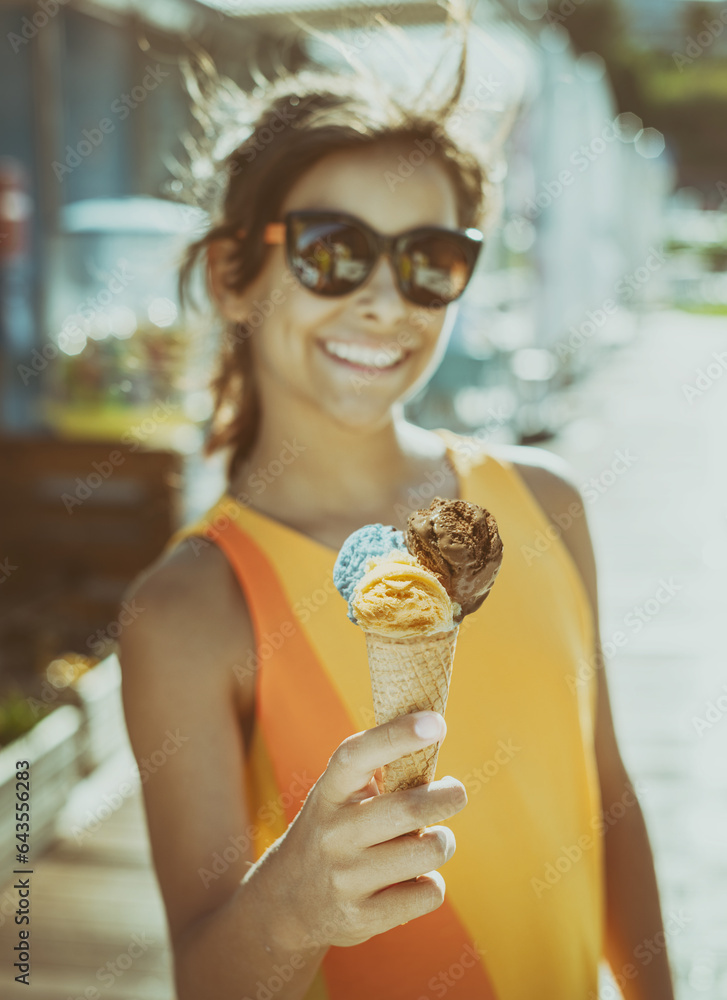 Happy, smiling girl holding ice cream cone with colorful ice cream balls. Sunny sea coastline at the background.