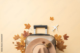 Planning an autumn getaway? Behold a top view image of a gray suitcase with autumn leaves around and a charming felt hat on a soothing beige background, perfect for your advertisement or text