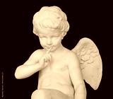 Angel statue isolated on white background. White stone sculpture of praying cherub isolated photo with clipping path