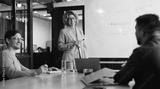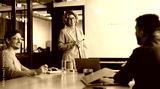 Group of professionals having a discussion in a meeting. Business woman stands in a boardroom doing a presentation