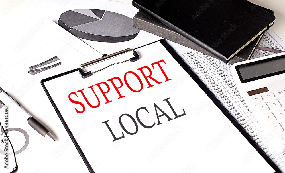 SUPPORT LOCAL text on paper clipboard with chart and notebook on withe background
