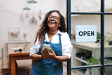 Successful small business owner holding a smartphone as she launches her shop