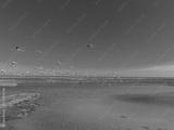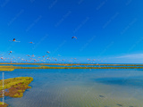Flock of flamingos above the river Ebro, the delta region of the Ebro River in the southwest of the Province of Tarragona in the region of Catalonia in Spain
