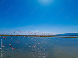 Flock of flamingos above the river Ebro, the delta region of the Ebro River in the southwest of the Province of Tarragona in the region of Catalonia in Spain