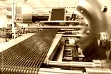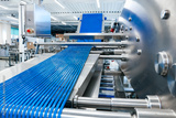 multi belt loader for sliced cheese meat products for production factory plant. Packing food in production line,machine in industrial factory. Dairy