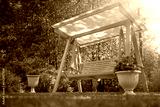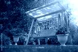 Wooden swing in the meadow near the house.Construction of furniture for the garden with your own hands. Landscape design of suburban construction.