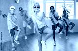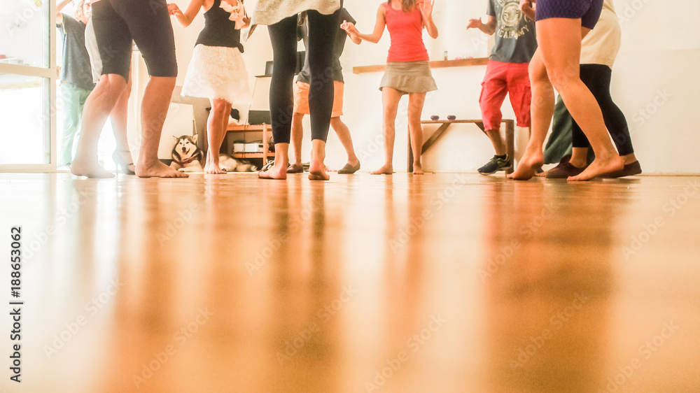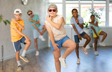 Smiling cute tween girl performing krump movements with group in dance studio. Form of artistic expression of modern children..