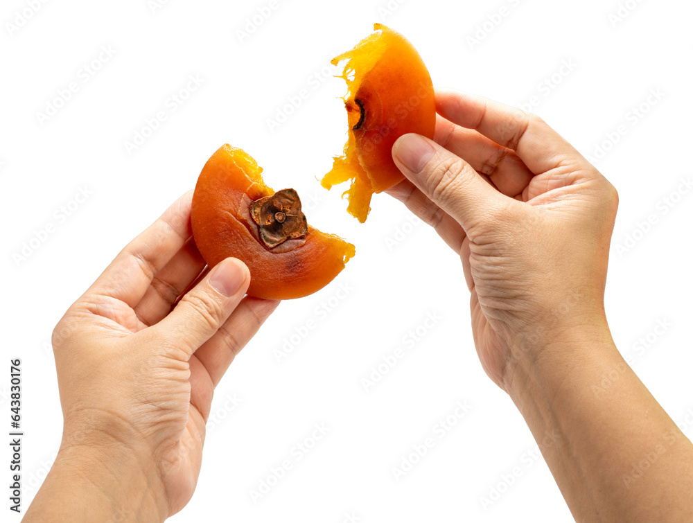 Hands holding Sweet Dried persimmon isolated on white background, Dried persimmon on White Background With clipping path