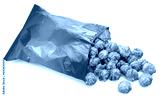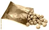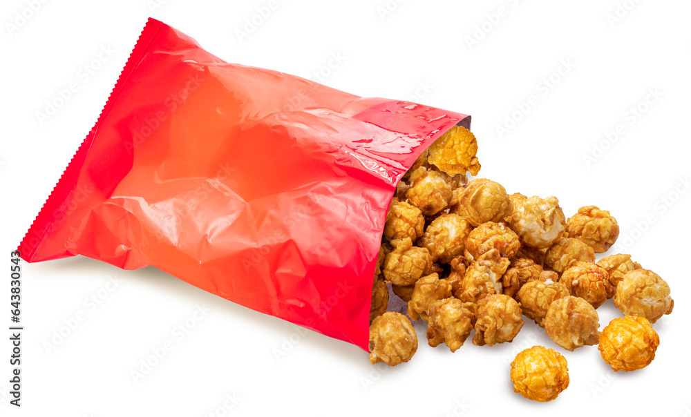 Caramel Popcorn fall out of Red bag isolated on white background, Mushroom Popcorn on white With clipping path.