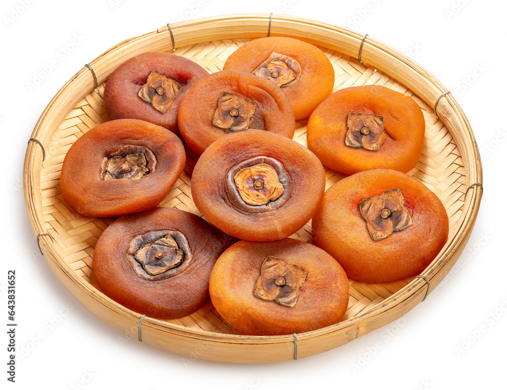 Sweet Dried persimmon on wooden plate isolated on white background, Dried persimmon on White Background With clipping path.