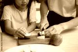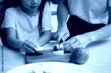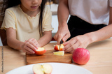 Happy family with father, mother and daughter in kitchen while mother chop apple fruit together at home, happiness mom, dad and child with bonding and relation, lifestyles and nutrition concept.