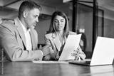 Business woman lawyer manager holding legal documents consulting mature older client at office meeting, two professional executives experts discussing financial accounting papers working together.