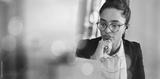 Business woman, thinking and planning on computer for Human Resources solution, recruitment website or vision. Professional HR worker or employee ideas and problem solving on laptop and banner mockup