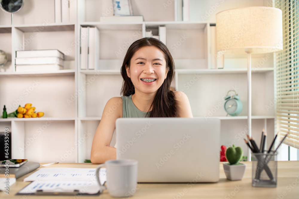 Woman using laptop to work or do homework at home with smiling face in her office, Creating happiness at work with a smile, Live performance or vdo call with laptop, Work from home.