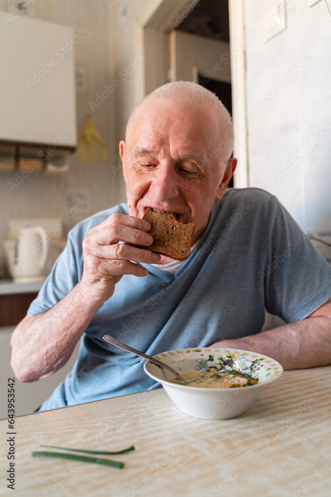 Elderly senior man eating soup with bread and green onion at home in the kitchen. Happy retirement, simple whole food.