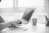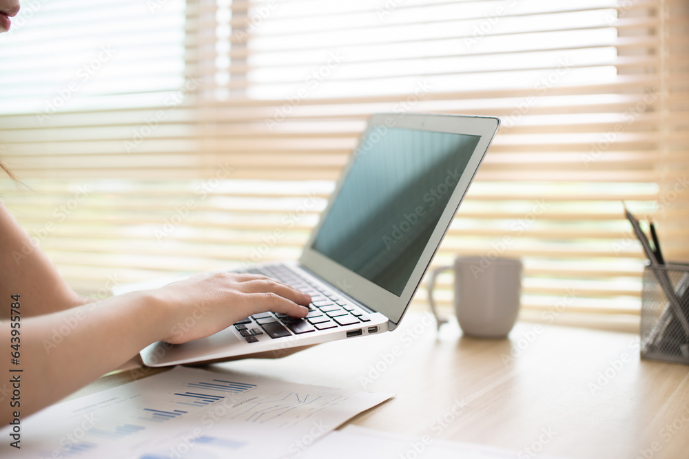 Woman using laptop to work or do homework at home with smiling face in her office, Creating happiness at work with a smile, Live performance or vdo call with laptop, Work from home.