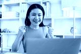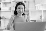 Joyful, Surprised or shocked Asian woman raised her arms all the way because she did a good job the boss gave her a big bonus making her very happy, Raise your hand, Smiling and screaming for success.