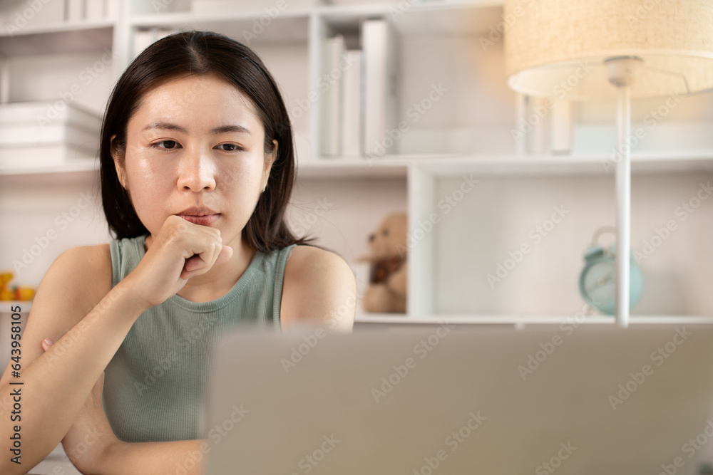 Woman using laptop to work or do homework at home with smiling face in her office, Creating happiness at work with a smile, Live performance or vdo call with laptop, Work from home.