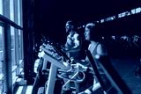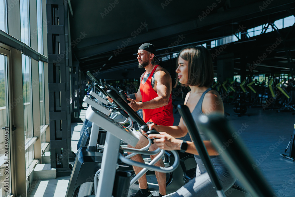 Two gym enthusiasts, a young man and woman, dressed for a workout session, engage in physical training, promoting fitness and health