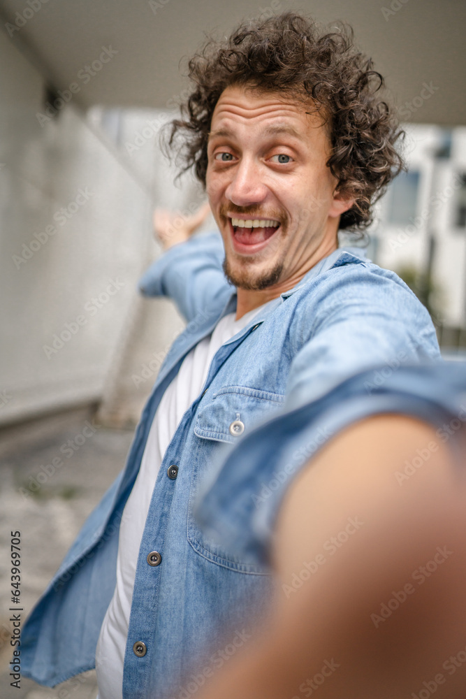 portrait of one caucasian adult man stand outdoor wear blue shirt