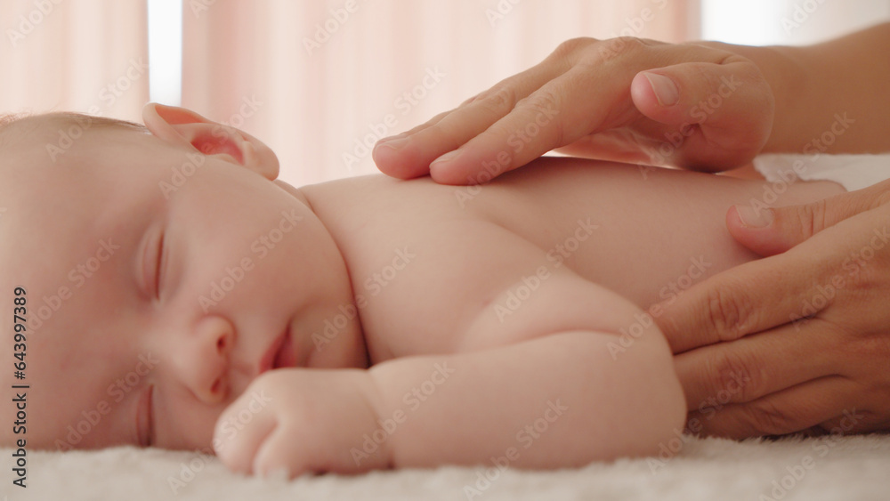 Mother doing massage on her healthy sleeping infant baby. Small caucasian newborn resting and laying on his belly while his mother is performing a massage for his small back and developing muscles. .