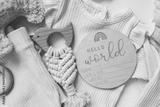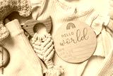 Fashion accessories for newborns, the inscription: hello world, a knitted toy and a holder top view