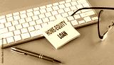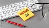 HOME EQUITY LOAN text on a sticky with keyboard, pen glasses on grey background