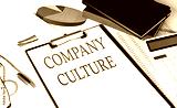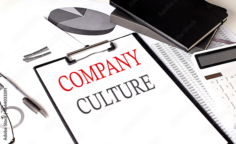 COMPANY CULTURE text on paper clipboard with chart and notebook on withe background