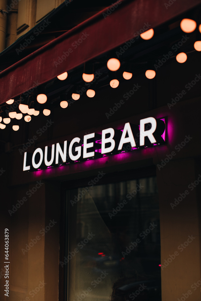 Neon sign on a black background, the inscription Lounge bar with pink light. Vertical
