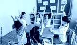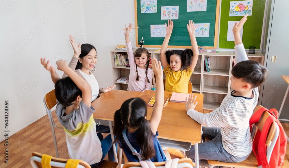 Multicultural group of students raising hand in class on lecture education, elementary school, learning people concept. Group team work of school kids with teacher sit in classroom floor raising hands