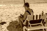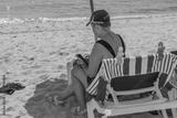 Close-up view of woman sitting on sun bed and surfing on her mobile. Miami Beach. USA.