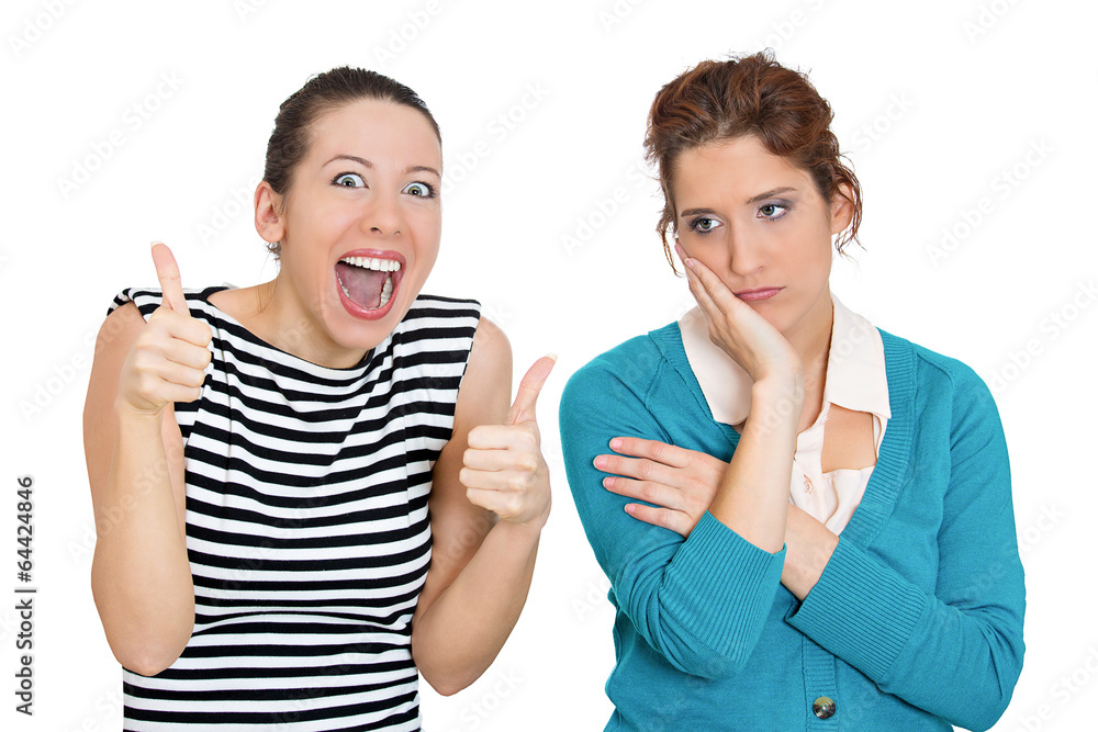 Two women pessimist, optimist on white background
