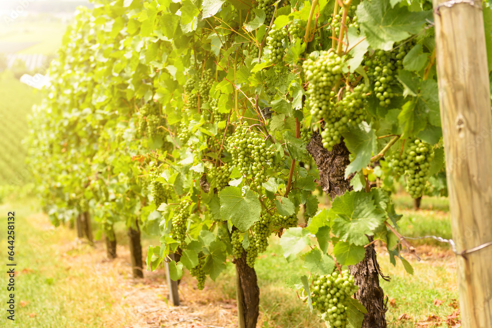 Vineyard in sunlight, growing grapes in wine farm on sunny day in summer