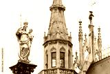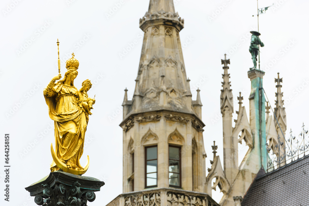 Virgin Mary statue on Marienplatz square by Town Hall, Munich, Germany.