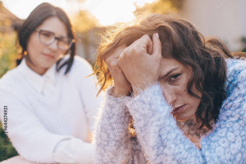 Two women sitting on sofa speaking at home