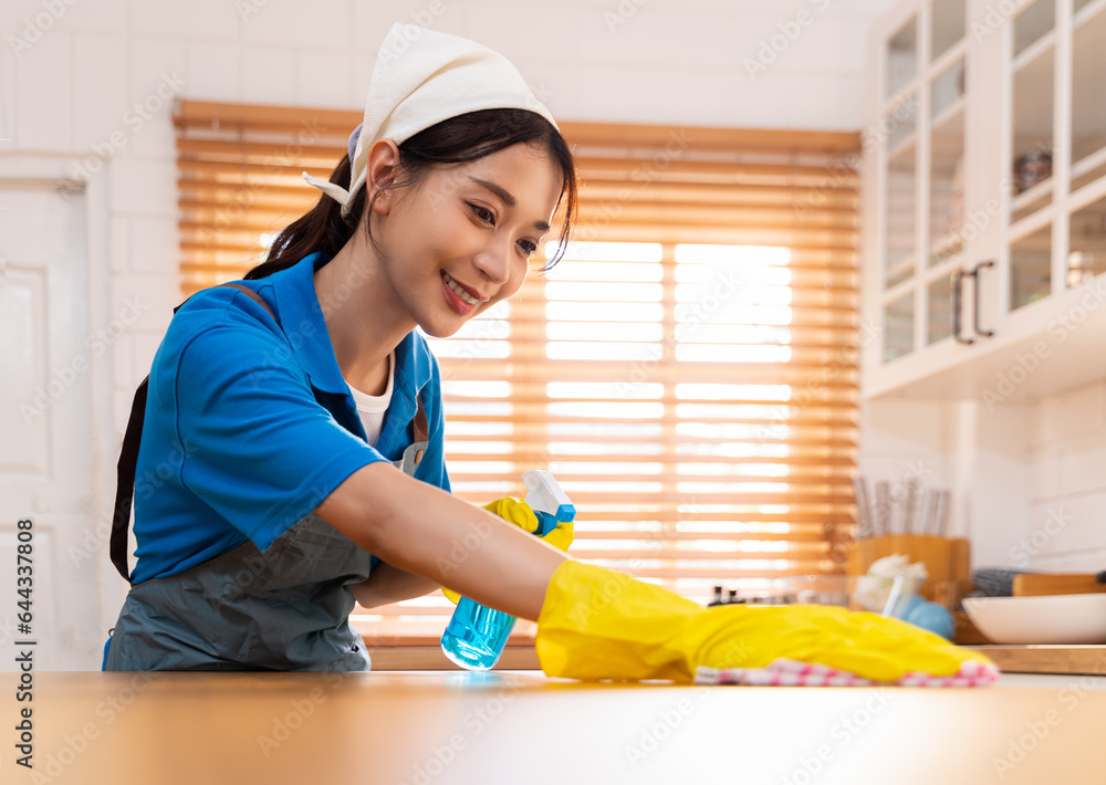 Cleaning staff spraying cleaning detergent on the table and wiping it clean at kitchen. Housekeeping staff wear uniforms, gloves and aprons when cleaning, wiping or sweeping in the customer's home