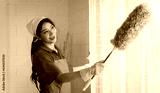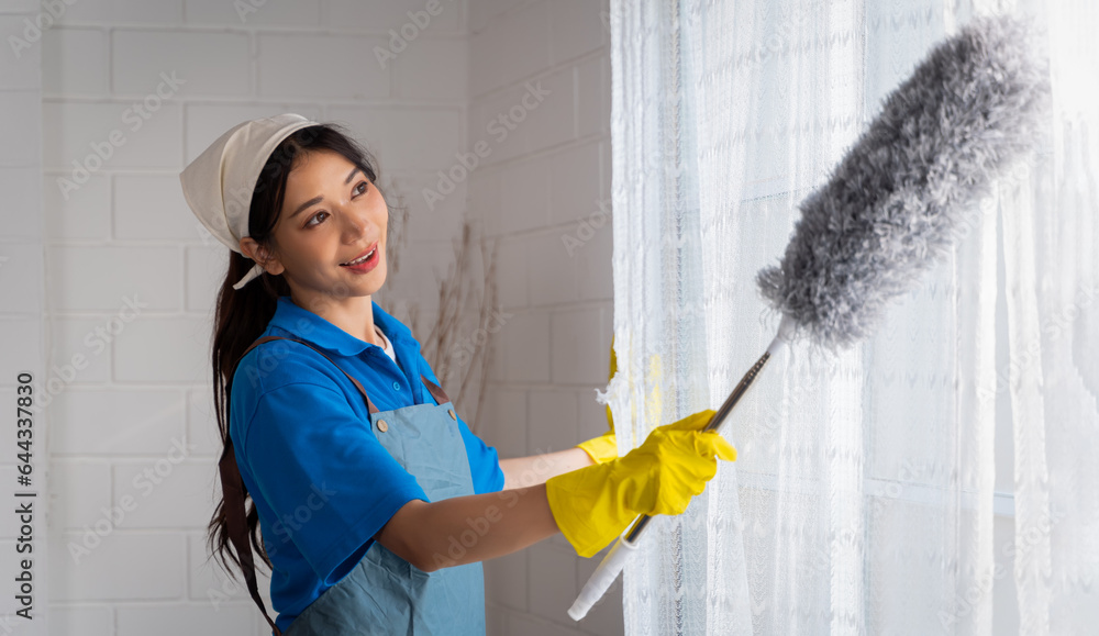 The housekeeping staff is using wood dusting and dusting curtains in the living room. Housekeeping staff wear uniforms, gloves and aprons when cleaning, wiping or sweeping in the customer's home.