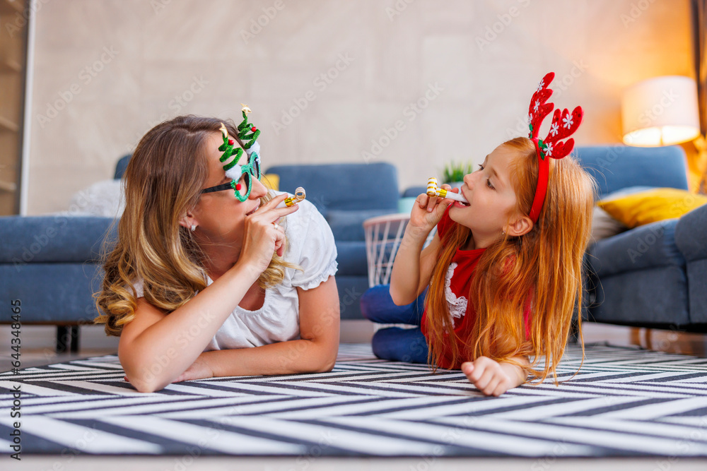 Mother and daughter playing and blowing party whistles while celebrating New Year at home