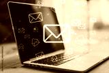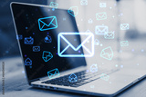 Close up of laptop computer on desk with glowing email letter icons on blurry background. Communication and business message concept.