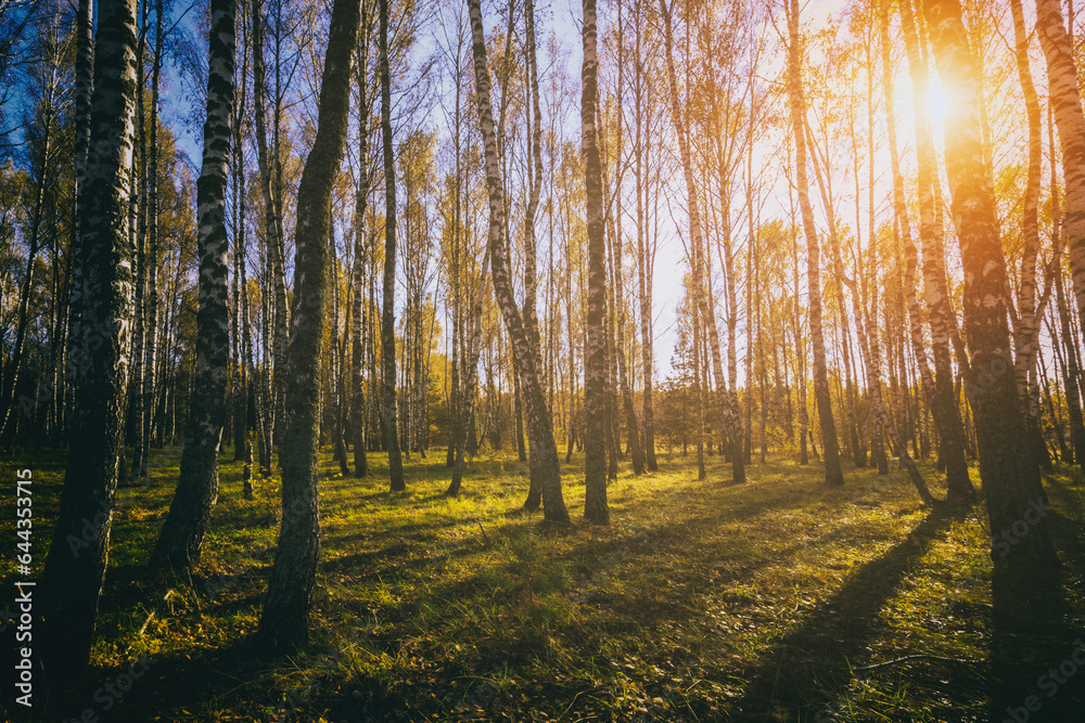 Birch grove with golden leaves in golden autumn, illuminated by the sun at sunset or dawn. Aesthetics of vintage film.